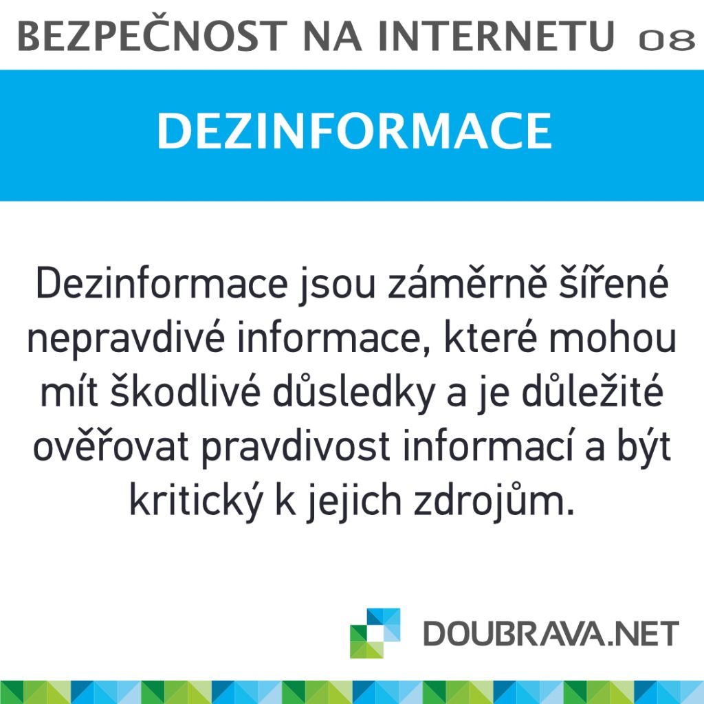 Dezinformace jsou záměrně šířené nepravdivé informace, které mají za cíl ovlivnit myšlení a jednání lidí. Tyto informace se mohou týkat politických, sociálních nebo ekonomických témat, a jsou často šířeny prostřednictvím sociálních médií a jiných online kanálů.